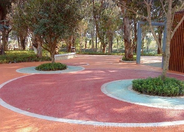 在傳統的熱碾式路面工藝中,鋪筑好瀝青砂膠層之后,以彩色石料按照每平方米 5kg 以上的用量代替部分普通石料,在瀝青砂膠層仍保持足夠溫度時散布碾壓,使石料部分嵌入瀝青砂膠層內,即可形成彩色路面。彩色石料的用量決定了這種路面的彩度。